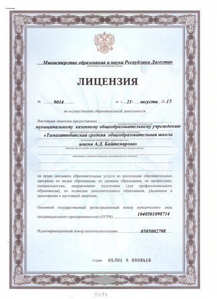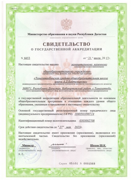 | Полное наименование образовательной организации* | Муниципальное казенное общеобразовательное учреждение" Тамазатюбинская средняя общеобразовательная школа им.А.Д.Байтемирова" |